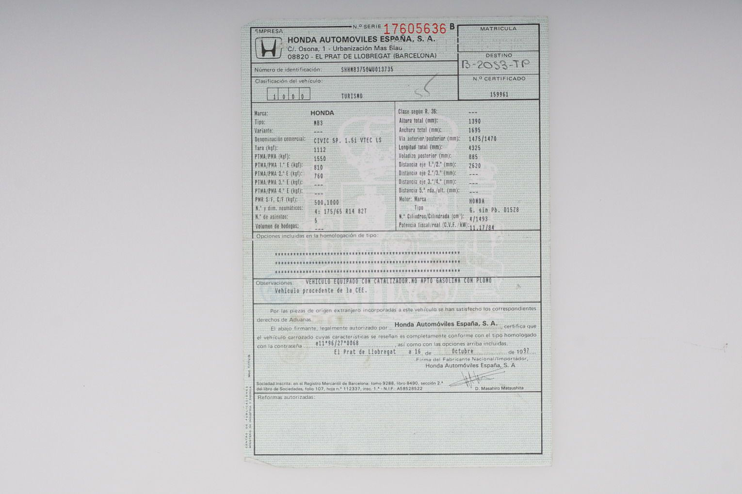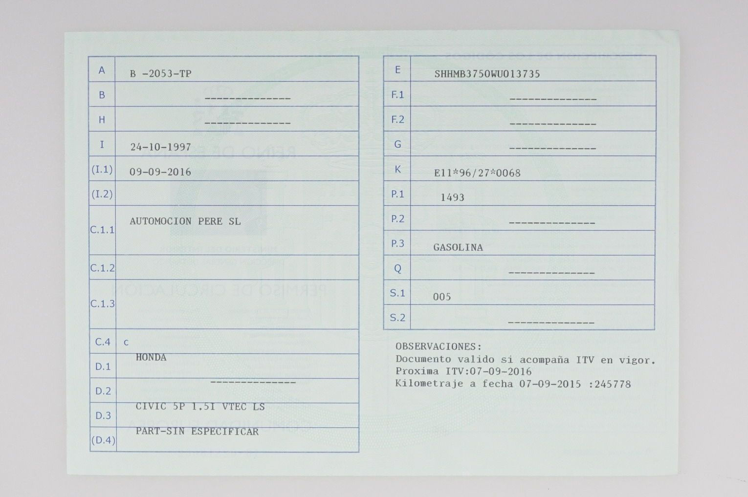 Honda Civic 1.5i 114 CV VTEC LS. Año 24/10/1997, Color Verde Metalizado, Aire Acondicionado, ABS, Doble Airbag, Asientos Deportivos, Dirección Asistida, 4 Elevalunas Eléctricos, Cierre Centralizado, Radio-CD, Faros Antiniebla.