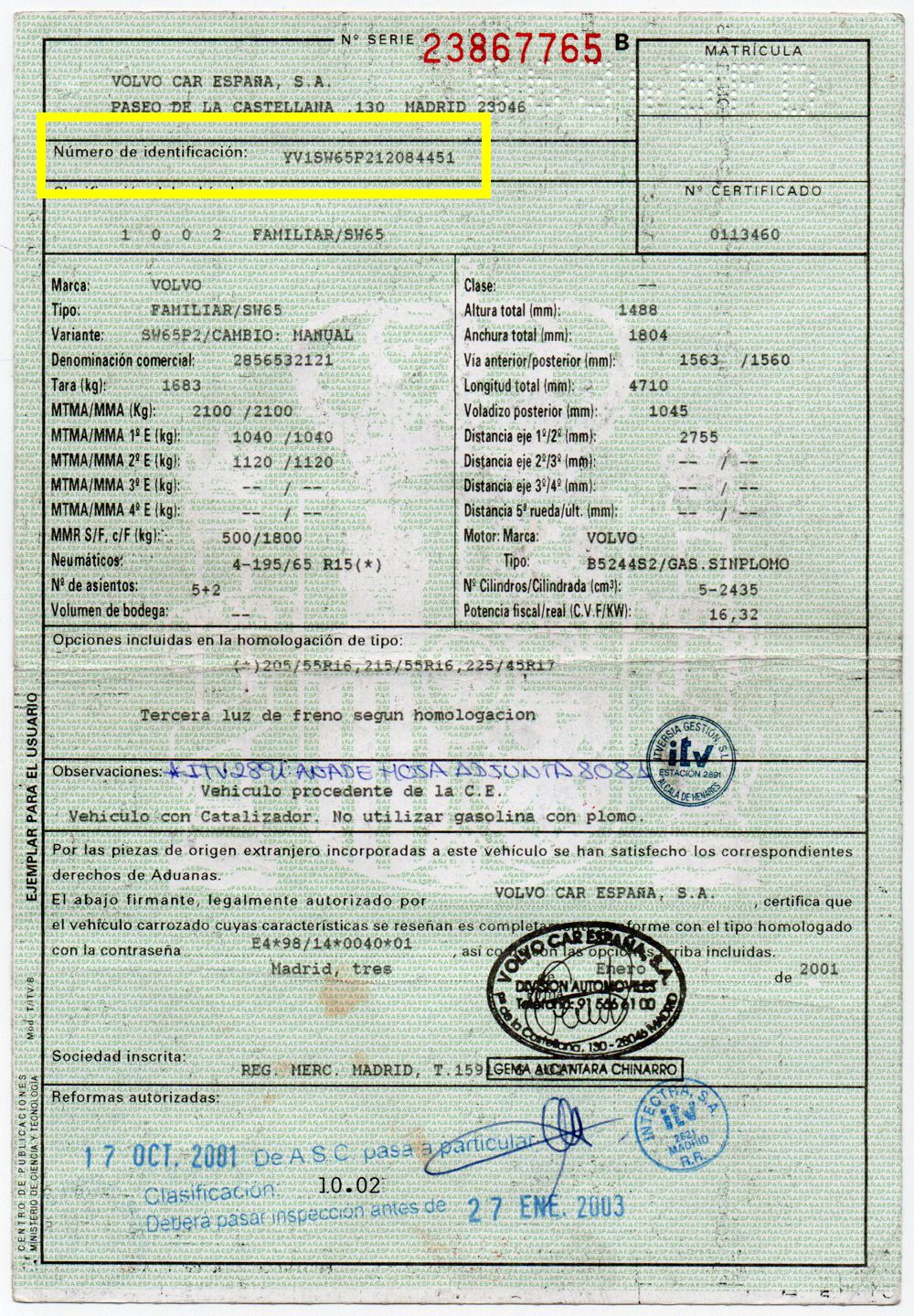 Bastidor: YV1SW65P212084451