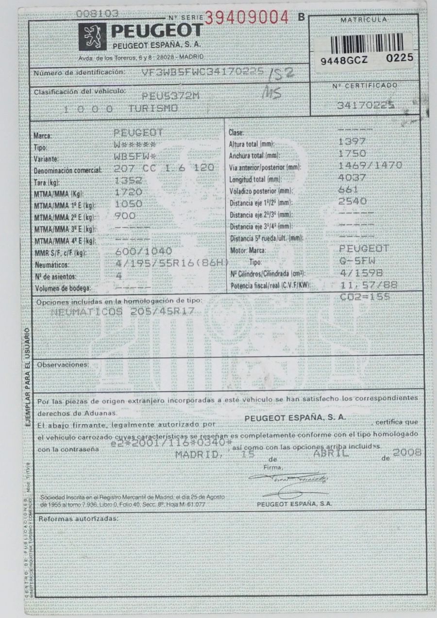 Peugeot 207 1.6i C.C 120 CV Sport. Año 04/2008. Climatizador, ABS, ESP, 4 Airbags, Dirección Asistida, Radio-CD con Mandos en el Volante, Bluetooth, 4 Elevalunas Eléctricos, Cierre Centralizad con Mando, Ordenador de Viaje, Llantas, Faros Antiniebla, Retrovisores Eléctricos. Muy Buen Estado. Pocos Kms.